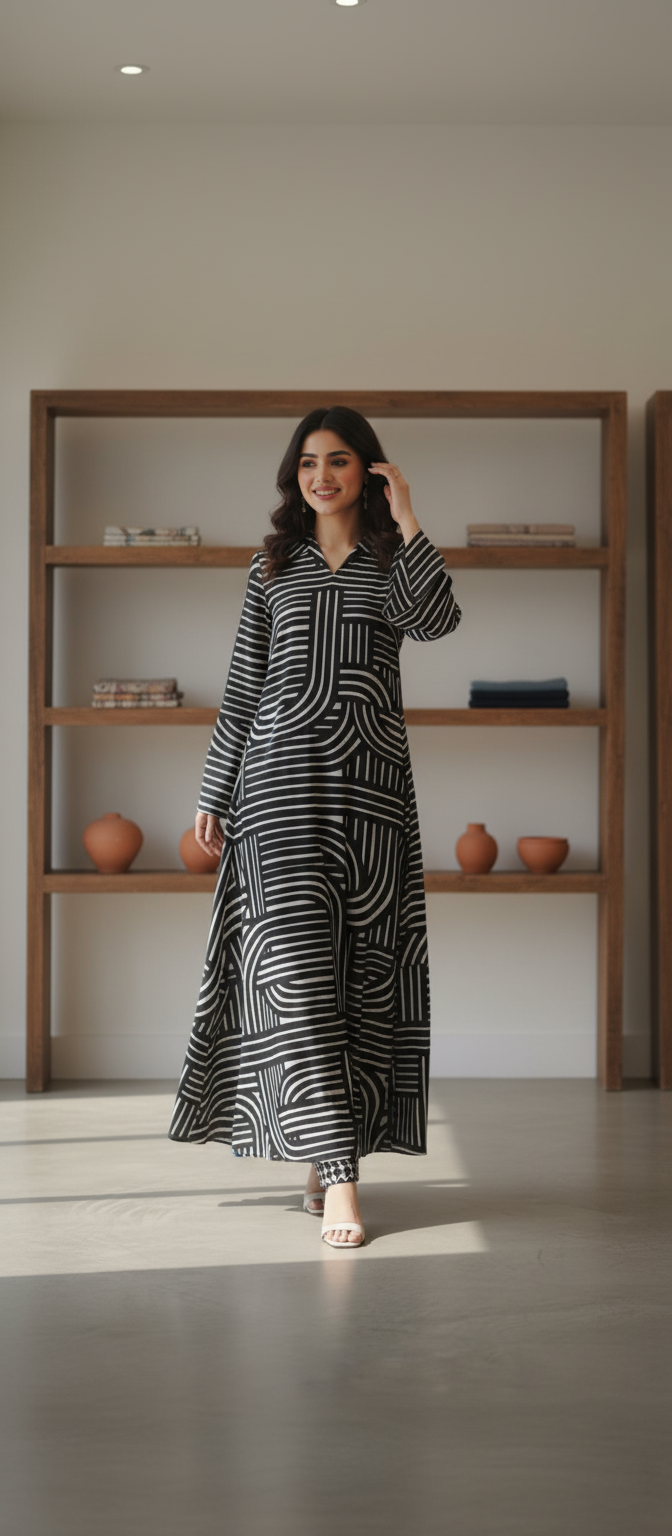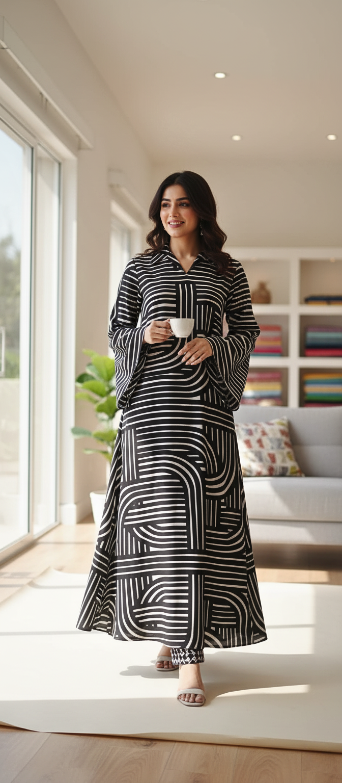 Elegance meets comfort in our Nazneen Kaftan, crafted from premium Georgette fabric. This chic piece features a bold black-and-white linear pattern that adds a touch of modern sophistication to a timeless silhouette. The soft, flowy Georgette drapes beautifully, offering effortless grace and movement. Perfect for casual gatherings or relaxed evenings, Nazneen Kaftan embodies refined simplicity with a statement style — a true blend of comfort and class.