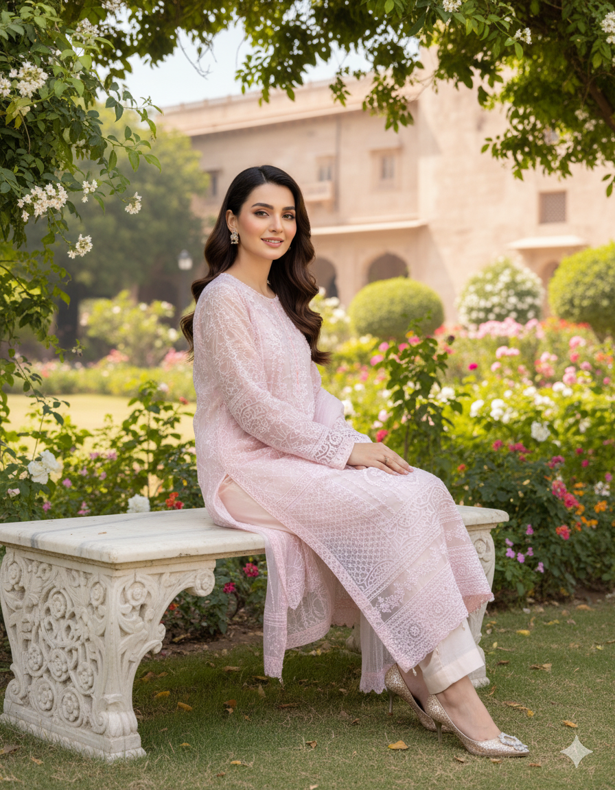 Radiate grace with the Luxury Pink Organza, exquisitely tailored from delicate organza fabric. The soft pink hue paired with intricate embroidery creates a timelessly elegant look, perfect for adding a touch of luxury to any occasion. Its lightweight texture and graceful drape make it an ideal choice for festive celebrations and refined gatherings.