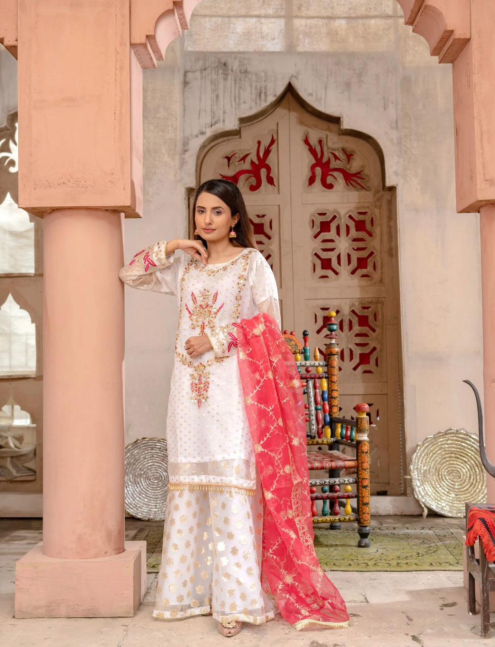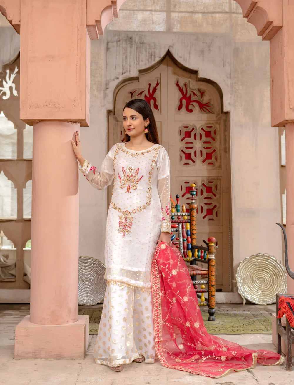 Radiate grace with the Golden Aura dress, exquisitely tailored from delicate organza fabric. The white and red hue paired with intricate embroidery creates a timelessly elegant look, perfect for adding a touch of luxury to any occasion. Its lightweight texture and graceful drape make it an ideal choice for festive celebrations and refined gatherings.